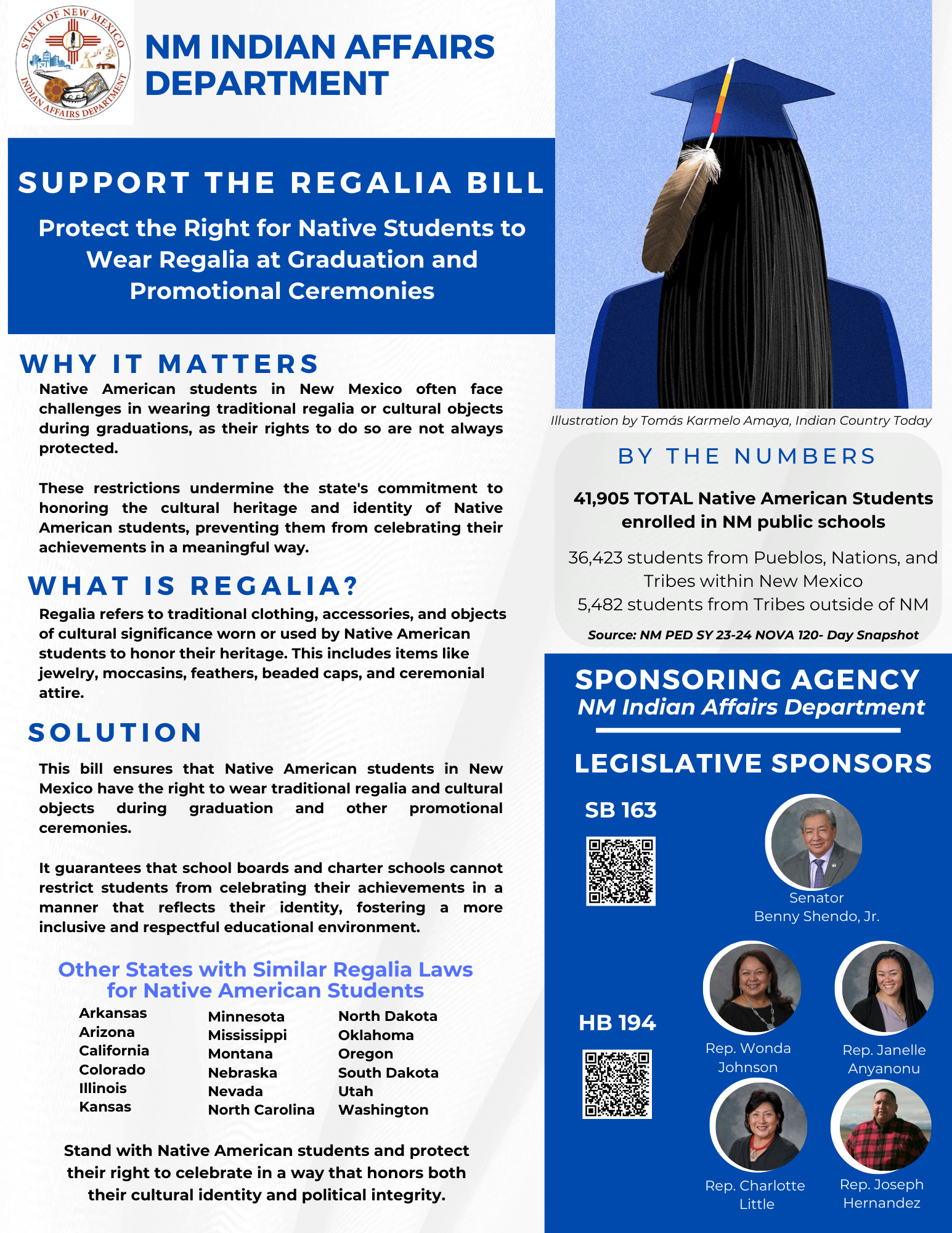 The Tribal Regalia law permits Native American students who attend state public and charter schools to wear tribal regalia at graduation ceremonies and public school events. The legislation defines tribal regalia as “a tribe’s traditional dress or recognized objects of religious or cultural significance, including tribal symbols, jewelry, beading and/or feathers.” New Mexico Governor Michelle Lujan Grisham signed the Tribal Regalia bill into law on March 19, 2025. This was signed into law with an emergency clause to take effect immediately and apply to students graduating in 2025. New Mexico joins 19 other states who have similar regalia legislation.