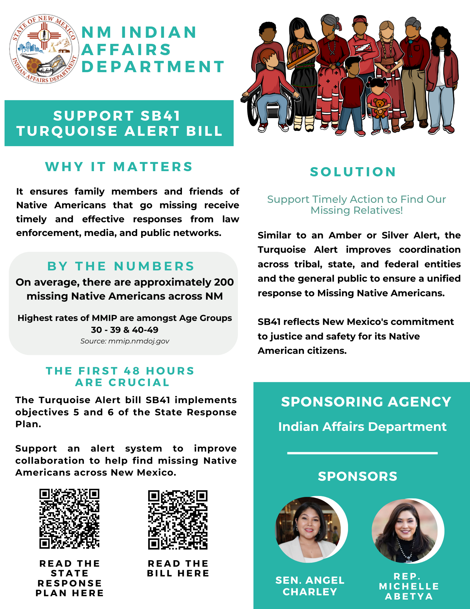 The Turquoise Alert is a specialized emergency response to address the crisis of missing Native Americans across the state of New Mexico. This alert system requires the Department of Public Safety (DPS) to develop and implement a Turquoise Alert plan for the purpose of disseminating information about a person subject to the alert through media, law enforcement, cell service providers (in some cases) and state employees. For DPS to activate the alert, there are specific criteria that must be met for the missing person. Governor Michelle Lujan Grisham signed the Turquoise Alert into law after the 2025 Legislative Session, making New Mexico is the fifth state to implement an alert system for missing Native Americans.